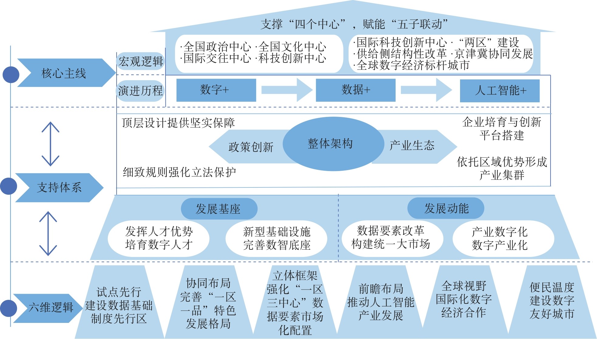北京作为首都和国际科技创新中心,高度重视把握新一轮科技革命机遇。以数字经济为核心,探讨了北京在数智化转型中的新模式、新经验与新思路。围绕北京市数智化转型的主线展开,说明其背后与北京市宏观政策的关系与演进历程,分析北京数字经济发展的支持体系。最后总结了北京创新发展数字经济的六维实践经验。