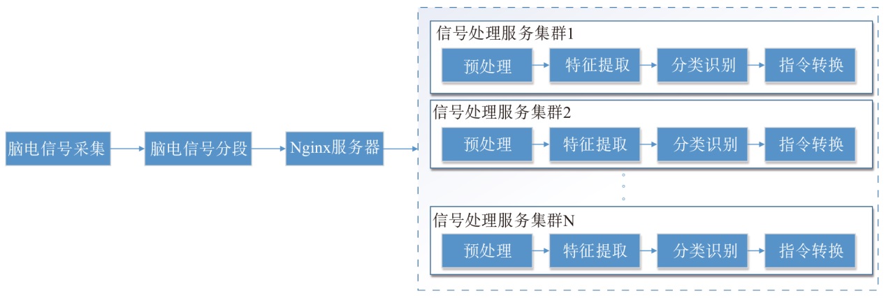 With the widespread application of Electroencephalogram (EEG) signal processing technology in medical, neuroscience, and human-computer interaction fields, traditional single-machine architectures face challenges such as limited computational resources, high latency, and poor stability in high-concurrency scenarios. This paper proposes a high-performance EEG signal processing cluster architecture based on Nginx load balancing. By leveraging Nginx’s reverse proxy technology, concurrent requests are distributed to distributed nodes, combined with standardized data processing workflows and a unified cluster entry point, significantly improving real-time performance of system, resource utilization, and throughput. Experimental results demonstrate that under 100~2 000 concurrent loads, the cluster architecture achieves notable optimizations in both average and minimum response time, along with a substantial increase in throughput. Additionally, Nginx’s IP access control strategy effectively blocks unauthorized requests, ensuring data security. The architecture enables efficient resource scheduling through dynamic load balancing, providing robust technical support for large-scale neural data processing. Future work will integrate artificial intelligence and edge computing technologies to extend the architecture to complex EEG analysis scenarios, advancing precision medicine and intelligent interaction development.